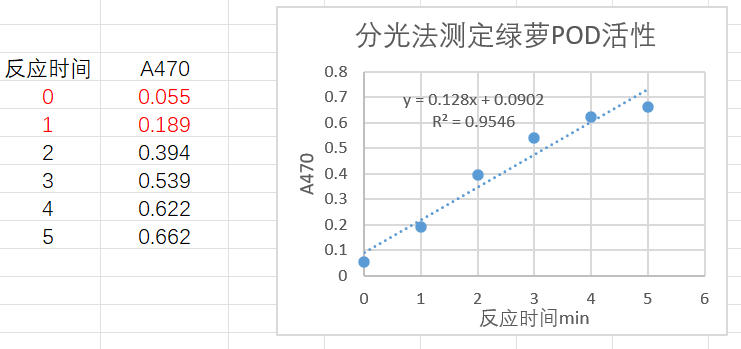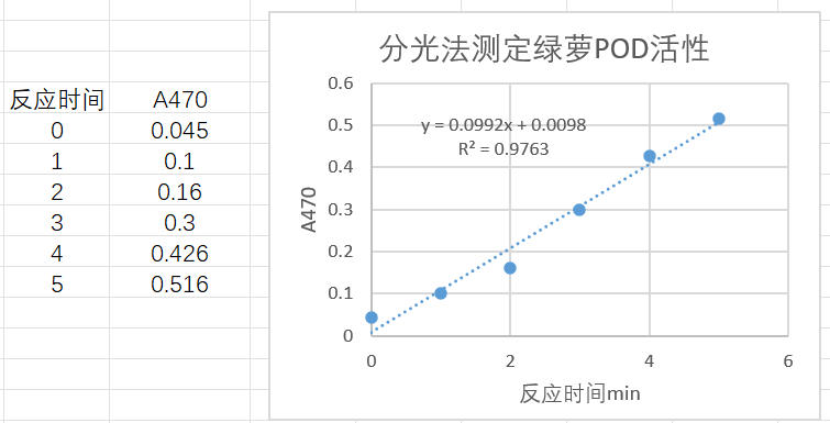 取0.5 克綠蘿葉片,加入5 ml提取液冰浴勻漿,制成10%勻漿液,12000 rpm 4℃離心10 min,取上清置于冰上,按照測定步驟操作,使用1 ml石英比色皿(光徑1 cm),設(shè)定分光光度計檢測波長470 nm,間隔1 min記錄數(shù)據(jù),采集5次;時間對吸光值做線性回歸曲線,3-4 min線性較好,1 min內(nèi)△A=0.426-0. 3=0.126。